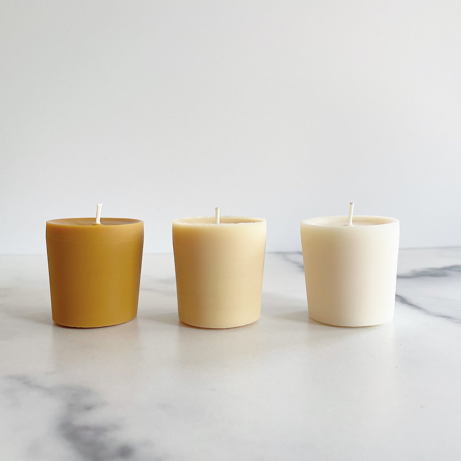 Hand poured all natural soy blend votive candles. Made with essential oils and offers a cleaner burn. Each box contains four candles. Choose from Unscented, Eucalyptus + Mint and Blue Spruce + White Tea. Burns for anywhere from 5-8 hours depending on the vessel used to burn the votive.