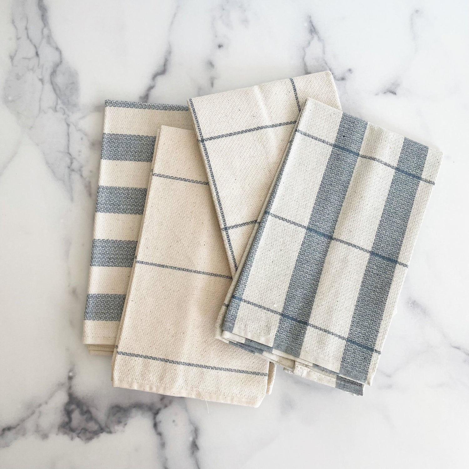 These kitchen towels are made with a special weave pattern for super absorbency and durability. Natural and blue denim color. The MEEMA farmhouse kitchen towel set have a corner loop for easy hanging, so any kitchen can be lovely and ready to shine. 100% cotton (80% upcycled). Dimensions: 20" x 28”. Set of 2 towels